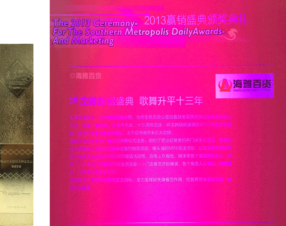 正值全球经济一体化高速发展时期,传统零售百货业正面临着其他零售百货业态带来的巨大冲击,海雅一路走来,从年中大庆、十三周年店庆·祥龙腾跃昭盛典到2013年度会员盛典,精心的布置和精密的筹划,无不给商圈带来巨大震撼。