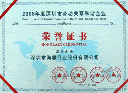 “2008年深圳市劳动关系和谐企业”评选活动于2009年7月落下帷幕,海雅百货喜获该荣誉称号。