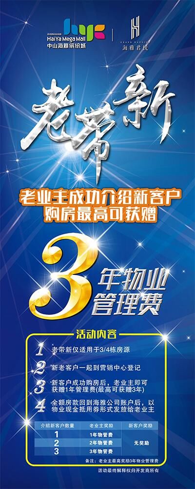 距离上一次的老带新活动,已经过去了几个月,有人欢喜有人忧,错过的业主们,活动又来袭,不要再错过哦!常规奖励最高可获得3年物业管理费。未获三年的老业主你们也可以继续带新粉,可累计至3年。