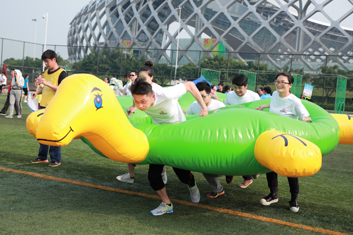 运动会共设置了5个项目,分别为考验运动能力的“奔跑吧!”、考验团队协作与智慧的“智慧汉诺塔”、“梦想起航”和强调团队合作能力的“龟兔赛跑”、“新铁人三项”。