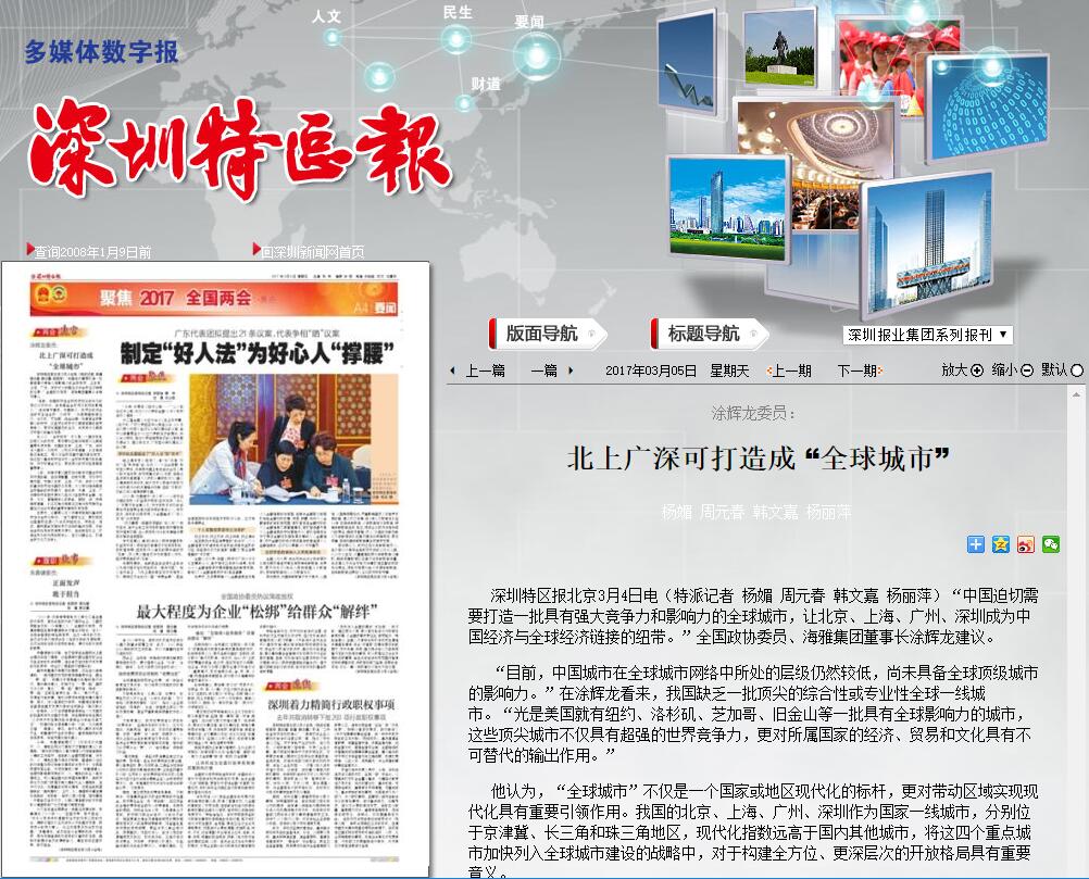 “中国迫切需要打造一批具有强大竞争力和影响力的全球城市,让北京、上海、广州、深圳成为中国经济与全球经济链接的纽带。”全国政协委员、海雅集团董事长涂辉龙建议。