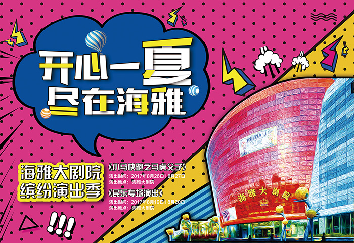 秉承'商业 文化'的全新理念,海雅文化传播公司一直致力于以文化艺术的独特趣味性及丰富性,给商业综合体注入更丰富的艺术新元素,吸引更多受众和顾客朋友的青睐,形成集团发展壮大的新合力。适逢暑期,由海雅集团主办的——开心一'夏'尽在海雅之海雅大剧院缤纷演出季现已隆重拉开帷幕,演出季包含8月19日至20日蓝启伦(马来西亚)追忆《永恒的经典古筝音乐会》民乐专场,8月26至27日大型原创儿童剧《小马快跑之马虎父子》、10月初中国丹麦联合制作安徒生童话音乐剧《海的女儿·黎明钟声》等重磅实力剧目。