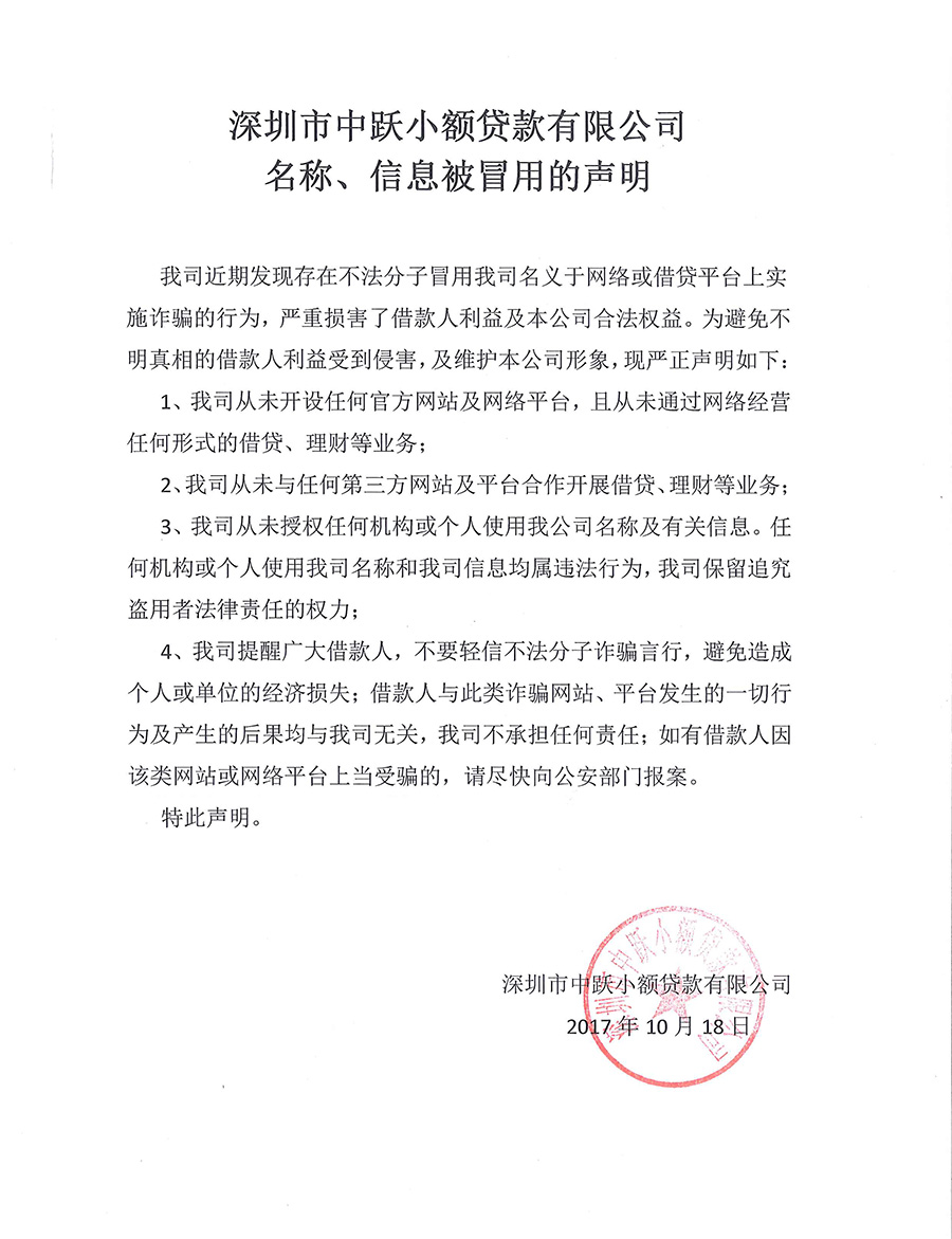 深圳市中跃小额贷款有限公司名称、信息被冒用的声明