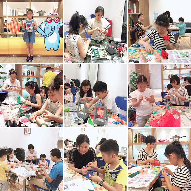 活动一开始,老师先向学员分发制作康乃馨花篮的材料,接着一边讲解一边示范制作过程,学员们一个个都听得聚精会神,迫不及待想要开始制作自己的花篮。轮到大家制作的时候,小朋友们和家长对各个步骤都一丝不苟、力求完美,剪裁、拧捏、粘贴、缝制……互相配合着完成一朵又一朵花的制作。花篮制作完成的时候,他们欣赏着自己的作品,脸上露出了骄傲而灿烂的笑容。