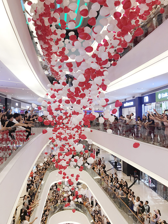 七夕当天,五楼侧厅已提前挂上纱网,铺上了数千只红白气球。从一楼侧厅往上看,仿佛铺成了悬空的云朵。在活动开始前半小时,各楼层和一楼空降位置已经开始围满了众多翘首以盼的顾客,大家都在期待本次“深圳首家空降气球雨”活动。8点一刻,胡桃里的驻唱歌手准时开唱凝聚人气,吸引了更多顾客循声前来。一曲唱完,数千气球应声而落,人群中不断传出赞叹和惊呼声,大家都在为这空降的浪漫情境而欢呼!气球降落期间更响起此起彼伏的拍照声,大家都用手机记录下缤纷城给他们准备的这份“浪漫”,并向身边的朋友、亲人进行二次、三次的传播,形成了良好的“刷屏”传播效应。千只气球下落后,更有许多顾客抢到本次随气球派发的惊喜礼券,兴高采烈地前往客服台兑领自己的奖品。看着每一张笑颜,仿佛都抒写了对此次七夕活动的喜爱与回味。