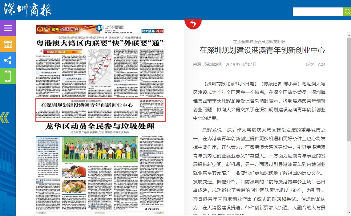 【深圳商报北京3月3日电】(特派记者 陈小慧)粤港澳大湾区建设成为今年全国两会一个热点。在深全国政协委员、深圳海雅集团董事长涂辉龙接受记者采访时表示,将聚焦港澳青年创新创业问题,拟向大会提交关于在深圳规划建设港澳青年创新创业中心的提案。