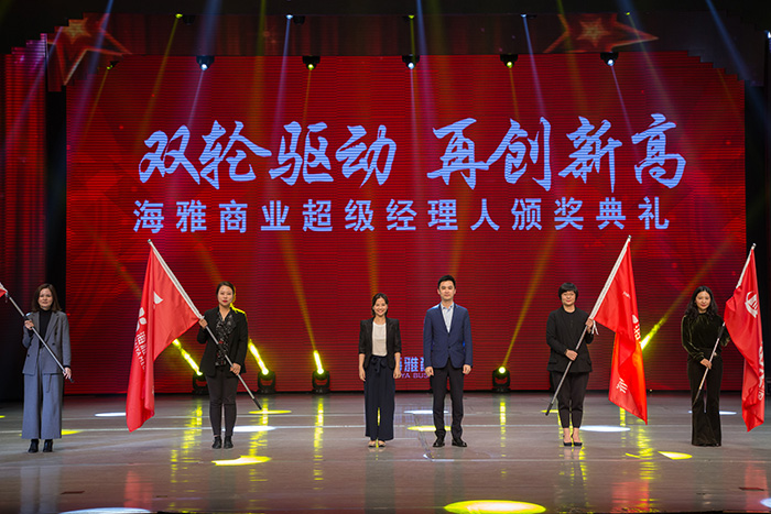 颁奖典礼的最后环节举行了项目授旗仪式,海雅集团常务副总裁、海雅商业总经理涂尔帆、海雅集团副总裁、海雅商业常务副总经理涂雪明为海雅缤纷城姚晓凤、海雅缤纷广场苏俐莉、海雅东城店于怡、海雅南城店朱素丹授予了象征追求与希冀的旗帜,各店纷纷喊出了各自振奋人心的口号,昭示着海雅商业每一个项目的不断创新,不断突破!