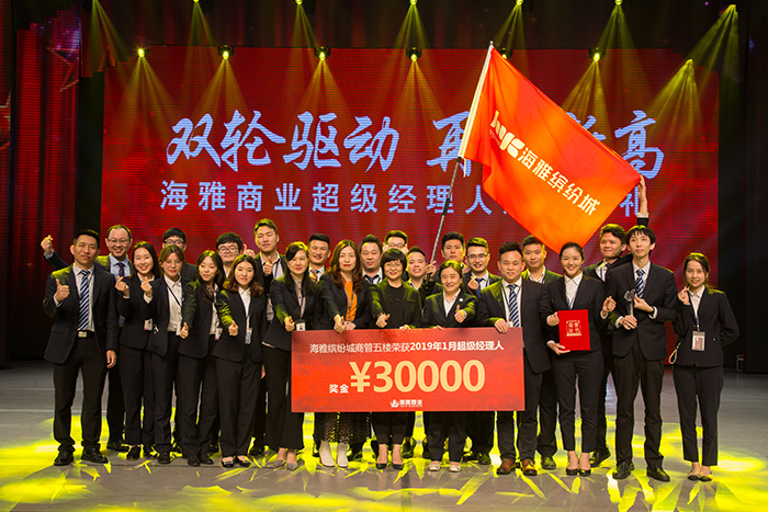 颁奖典礼上,涂尔帆揭晓了海雅商业2019年首届超级经理人获奖名单,并与涂雪明、姚晓凤一起为获奖者——海雅缤纷城商管五楼吴海龙团队颁发了奖杯、证书与30000元奖金,并合影留念。