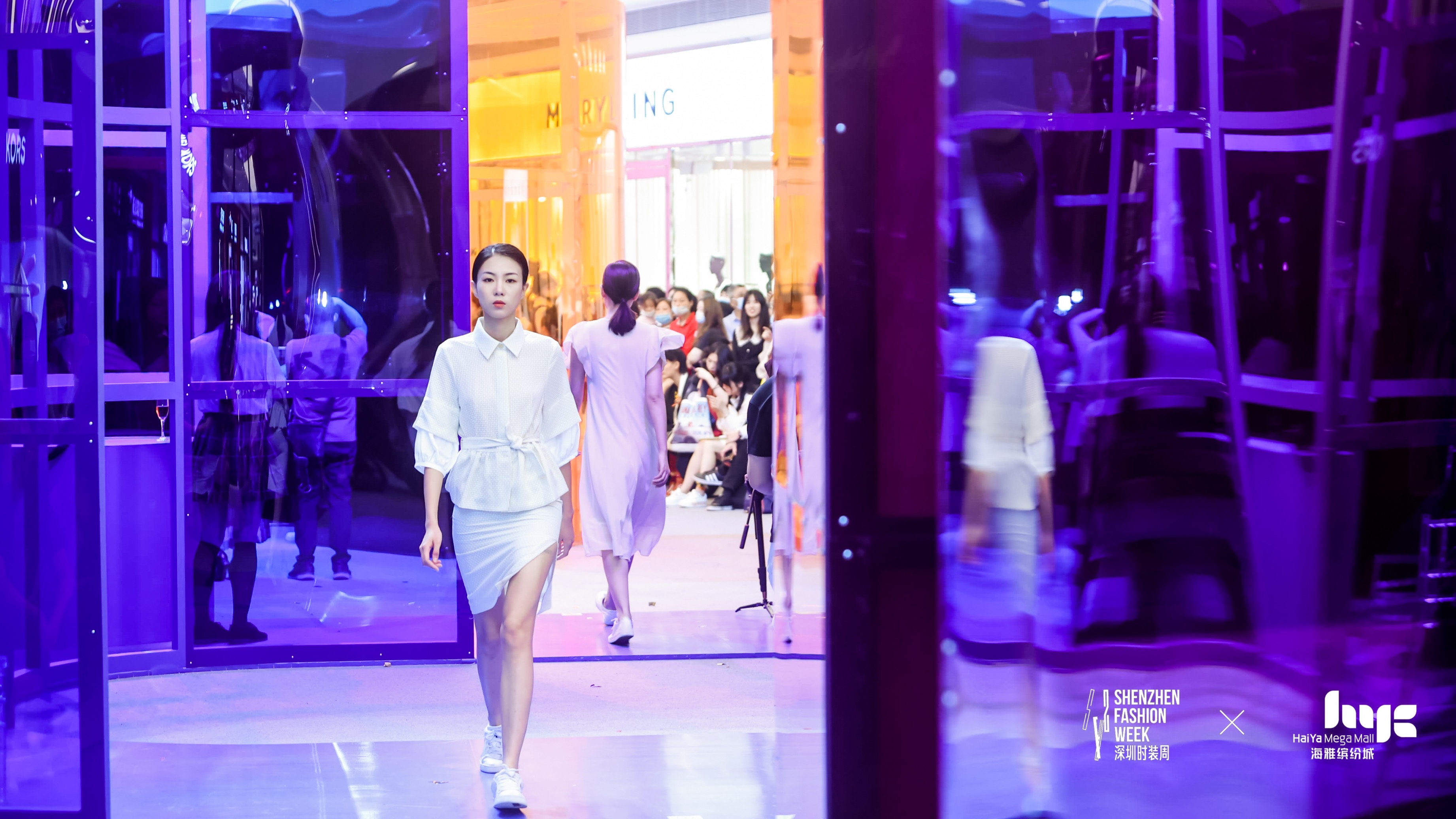与常规T台不同,海雅缤纷城时装周把秀场和快闪店的场景融合,模特穿梭在字母装置之间动态展示春夏新品服饰,实现了场景创新。快闪店的整体造型为4个透明彩色字母“ICON”组成的幻彩空间,内部作为深圳时装周特邀品牌的陈列空间,Theo VII、OWNLIFE往来、CLARA JACOB克莱雅限时独家开放线下零售快闪店,同时是时尚大秀的走秀现场,光影交错让时装在模特的移动中展示色彩的律动感和设计的前卫感,观众坐落在空间各侧看秀,享受全方位的通透视角。独特的工业风设计和迷幻的色彩空间也让快闪店成为了消费者的打卡热点。