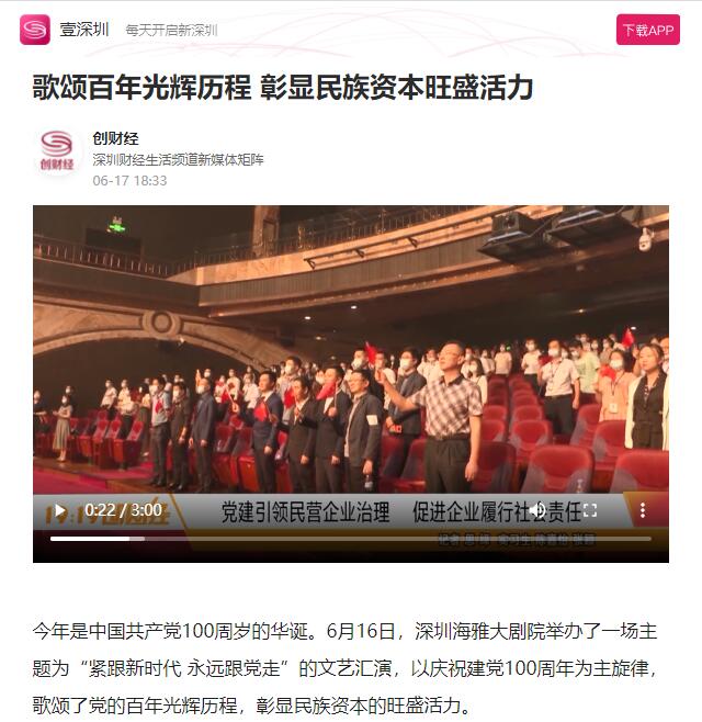 6月16日,深圳海雅大剧院举办了一场主题为“紧跟新时代 永远跟党走”的文艺汇演,以庆祝建党100周年为主旋律,歌颂了党的百年光辉历程,彰显民族资本的旺盛活力。
