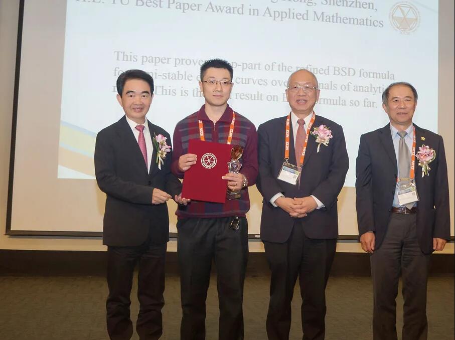涂辉龙(左一)为世界华人数学家联盟最佳论文奖获奖者颁奖。