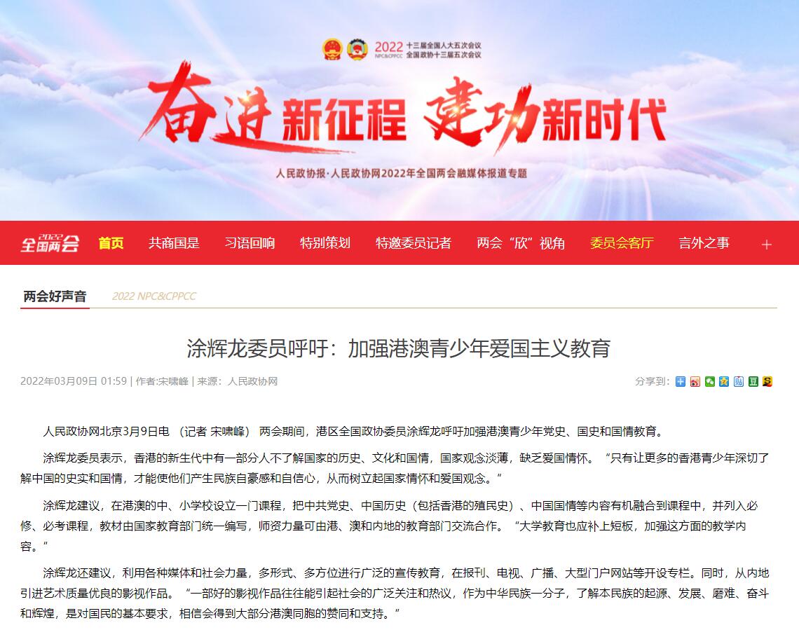 两会期间,港区全国政协委员涂辉龙呼吁加强港澳青少年党史、国史和国情教育。