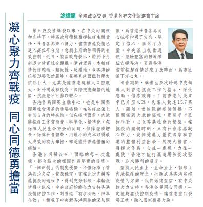 香港自回归以来,面临的每一次危机,都有强大的祖国作为坚实的后盾。“一国两制”的制度优势,不仅保障了香港长治久安、繁荣稳定,亦在此次支持香港抗疫的过程中,得到充分彰显。本轮疫情发生以来,中央政府始终全力支持香港疫情防控工作,对香港“有求必应、照单全收”,体现了中央对香港同胞的深切关怀,为香港社会各界同心抗疫指明了方向、坚定了信心、汇聚了力量。中央派出技术过硬、经验丰富的医疗队伍支持香港,更为香港当前抗击疫情送来了及时雨,为市民派下定心丸。