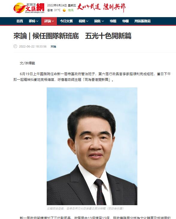 6月19日上午国务院任命新一届特区政府管治班子,第六届行政长官李家超顺利完成组班,当日下午即一起精神抖擞地亮相传媒,呼应着政纲主题“同为香港开新篇”。全国政协委员、香港各界文化促进会主席、海雅集团董事局主席涂辉龙博士表示:这批主要官员五光十色,星光熠熠。期望管治团队与香港市民一道团结一致,迎难而上,共同推动香港经济发展和民生改善,使香港成为更璀璨的国际级大都会,开启香港新未来。