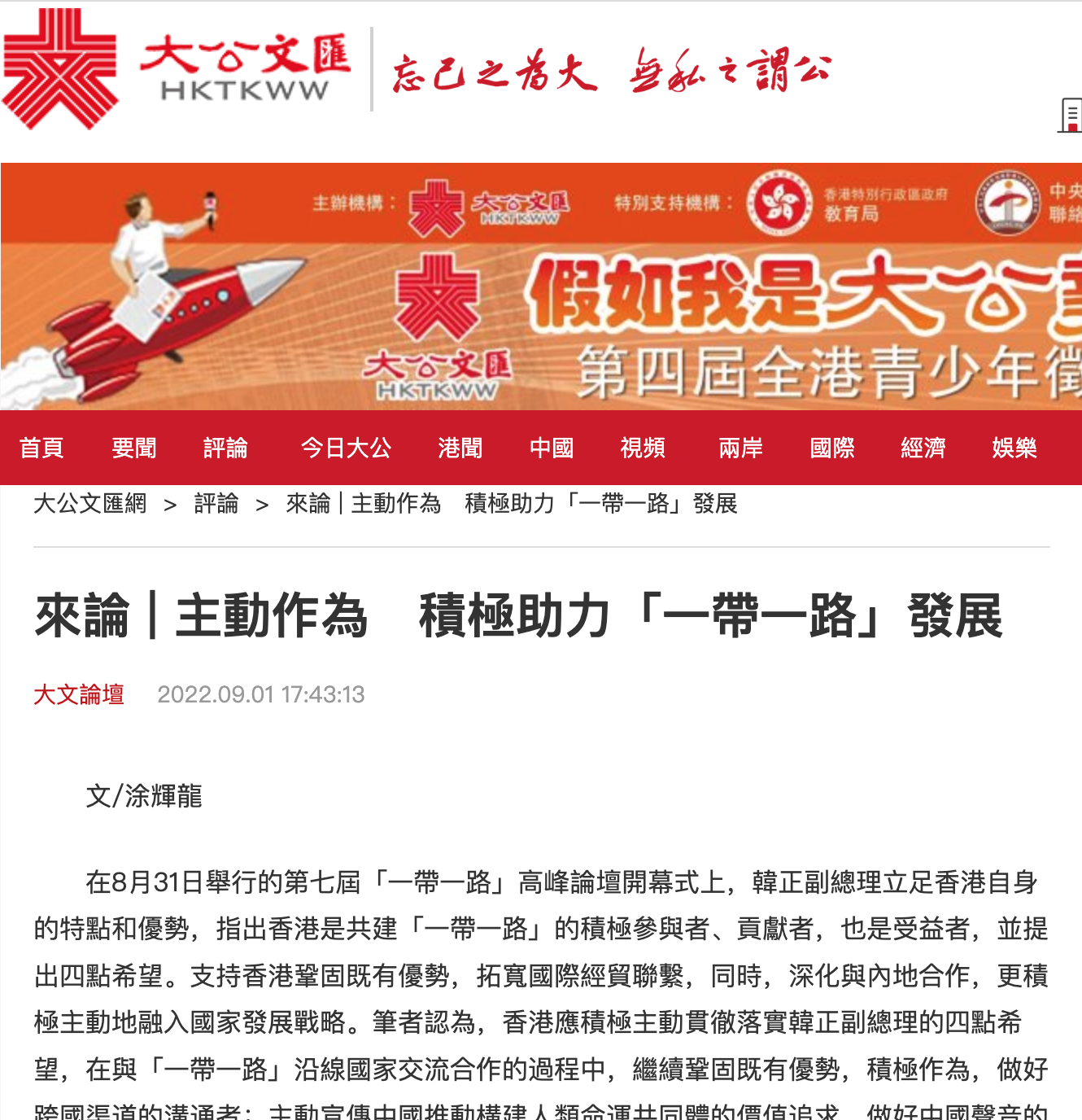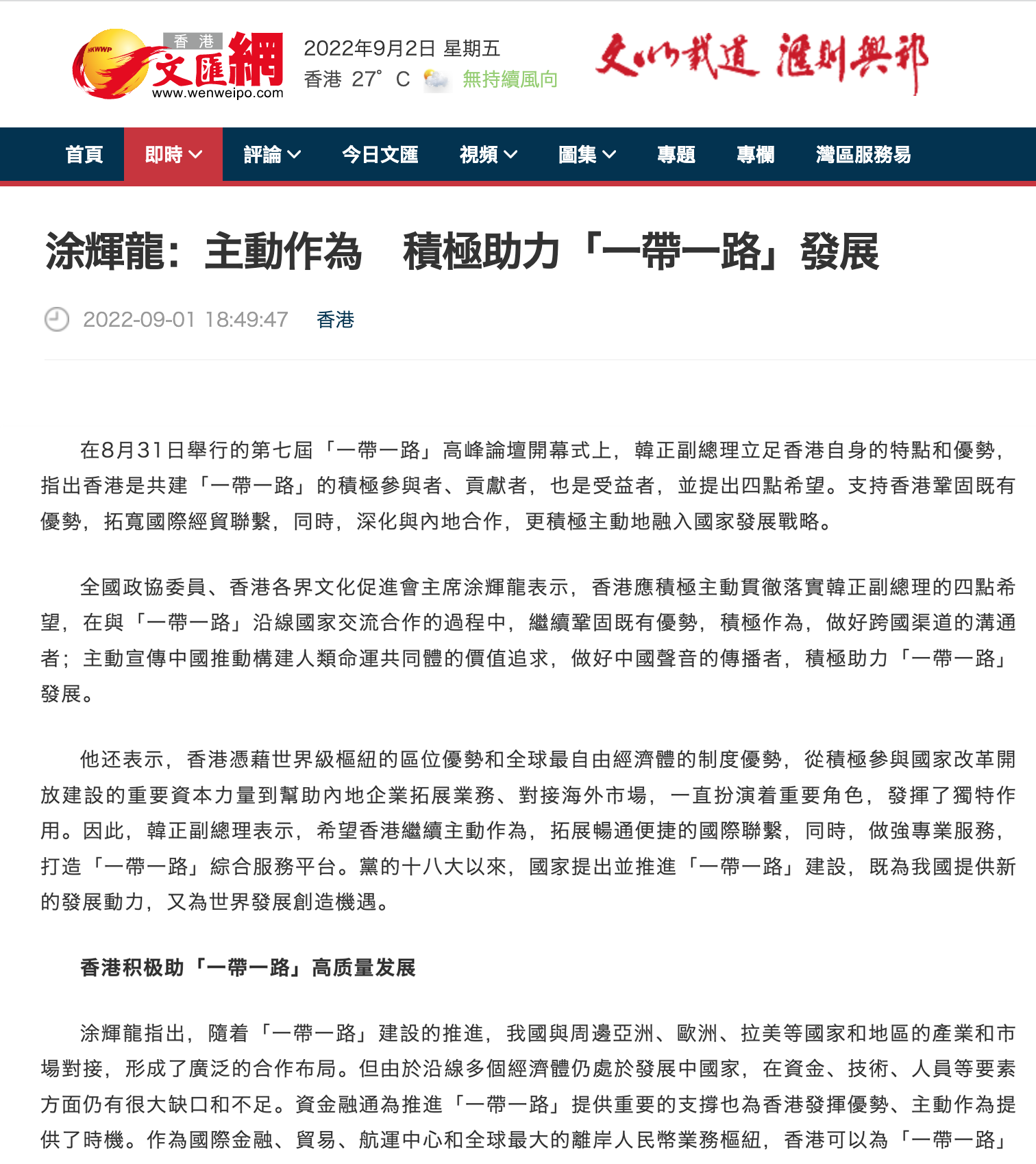 全国政协委员、香港各界文化促进会主席、海雅集团董事局主席涂辉龙表示,香港应积极主动贯彻落实韩正副总理的四点希望,在与“一带一路”沿线国家交流合作的过程中,继续巩固既有优势,积极作为,做好跨国渠道的沟通者;主动宣传中国推动构建人类命运共同体的价值追求,做好中国声音的传播者,积极助力“一带一路”发展。