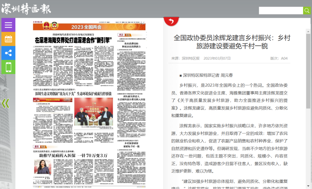 2023年全国两会,全国政协委员、香港各界文化促进会主席、海雅集团董事局主席涂辉龙博士,提出《关于高质量发展乡村旅游,助力全面推进乡村振兴的提案》。涂辉龙委员建议:乡村旅游项目应符合规划并逐级上报上级主管部门审批,避免同质化、分散化和重复建设;凡上级资助的项目必须进行专业的规划设计,报批后严格按设计进行建设;旅游主管部门要对存在问题的项目进行“会诊”,提出整改意见并协助基层做出完整的整改方案;必须关注扶持资金使用效果。提案全文如下: