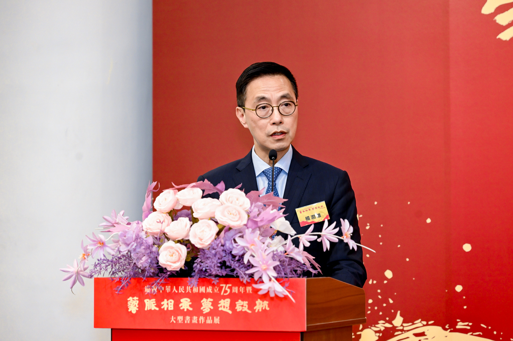 杨润雄局长在致辞中指,香港各界文化促进会举办此次大型书画览,既有名家大师经典作品,又有高校师生佳作,展示出当代青年对传统文化的继承与创新,可谓别出心裁、意义非凡。希望观众在观展览过程中,领略祖国的大好河山,感受中华优秀文化的无穷魅力。特区政府致力弘扬中华文化,并成立弘扬中华文化办公室。11月26日公布的《文艺创意产业发展蓝图》,为香港未来的文化艺术和创意产业订下愿景和发展方向,巩固香港中外文化艺术交流中心的地位。