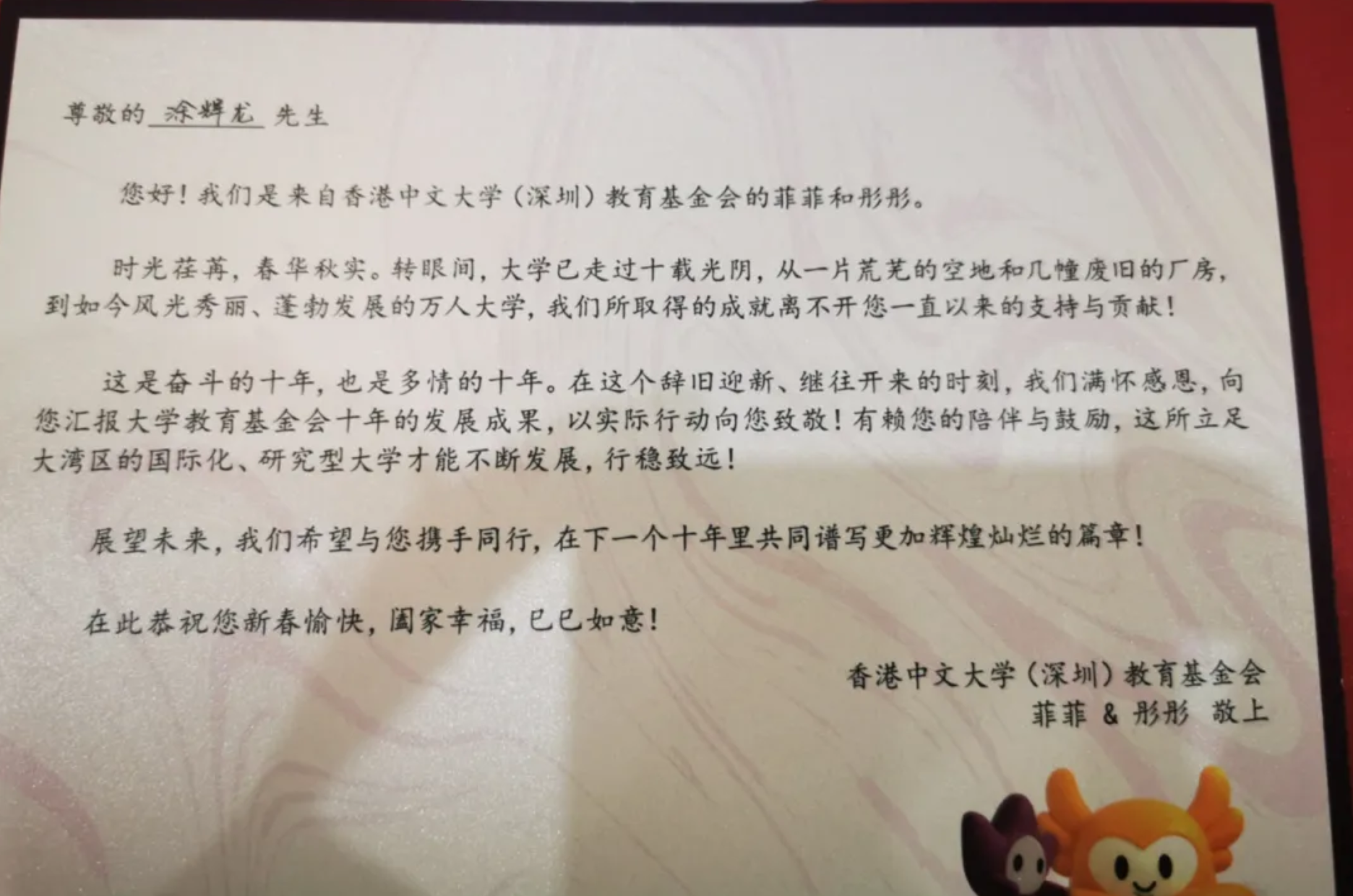 30多年来,海雅集团董事局主席涂辉龙先生以企业和个人名义向社会公益慈善事业、救灾救济等捐献款物超过7.3亿元,捐建多所希望小学、医院、敬老院,组织、倡导、募集教育基金1.6亿元,支持落后地区兴建公路大桥和教学楼,成立社会教育基金推动当地教育事业发展。曾向香港中文大学(深圳)捐资一亿元人民币,设立“涂辉龙创新科技教育基金”,在2024年香港中文大学(深圳)建校十周年时,收到基金资助的多名学生发来的感谢信。