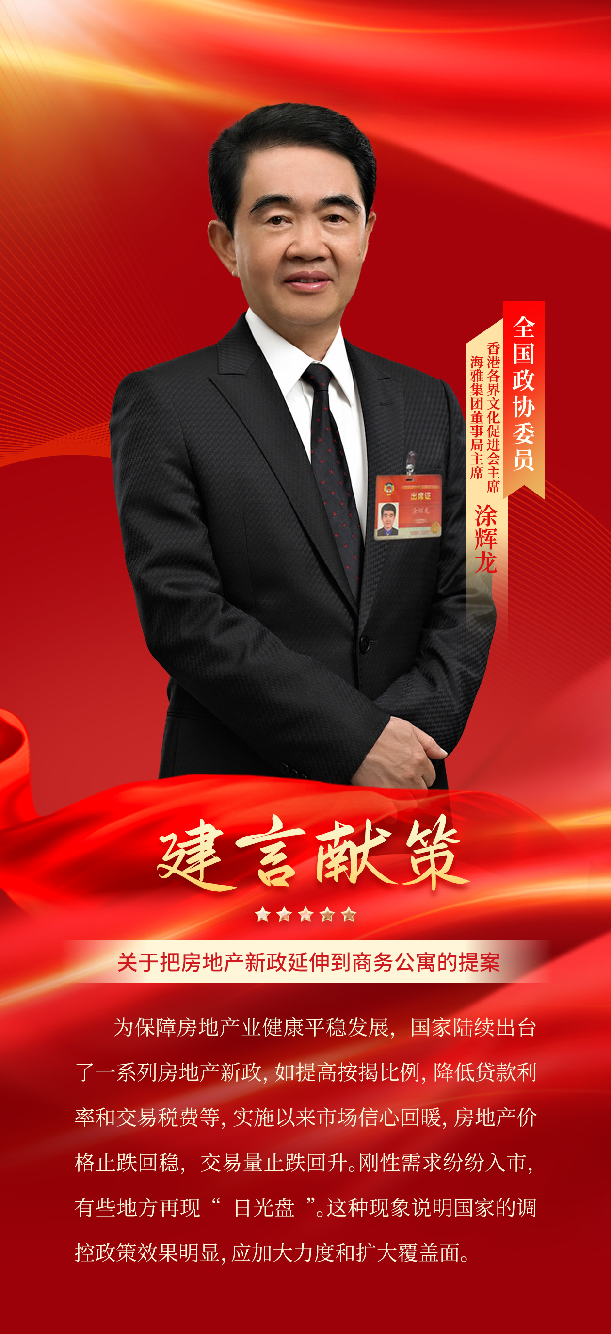 聚焦两会丨全国政协委员涂辉龙:关于把房地产新政延伸到商务公寓的提案