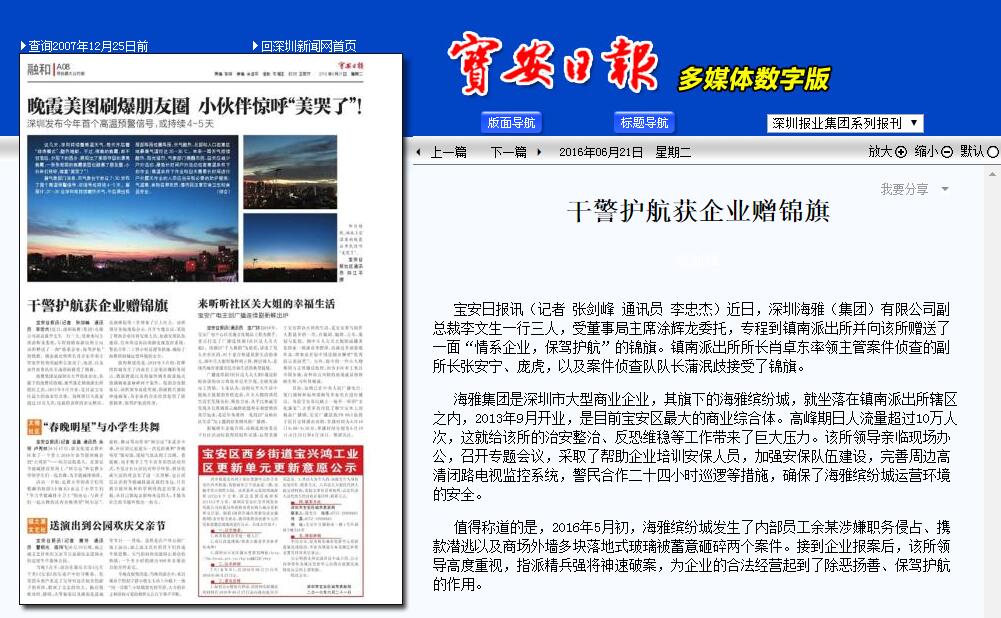 近日,深圳海雅(集团)有限公司副总裁李文生一行三人,受董事局主席涂辉龙委托,专程到镇南派出所并向该所赠送了一面“情系企业,保驾护航”的锦旗。镇南派出所所长肖卓东率领主管案件侦查的副所长张安宁、庞虎,以及案件侦查队队长蒲泯[详情]